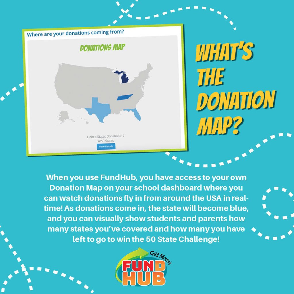 Using our online fundraising system,FundHub, you can access a donation map for your school to see where donations are coming from in real-time!
