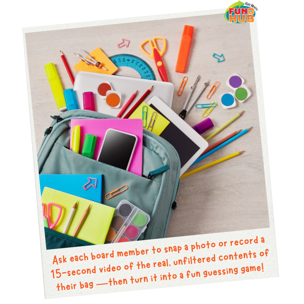 What to do: Ask each board member to snap a flat-lay photo or record a 15-second video of the real, unfiltered contents of their bag before a PTO/A meeting or school event. No staging required—half the fun is in the mess!
