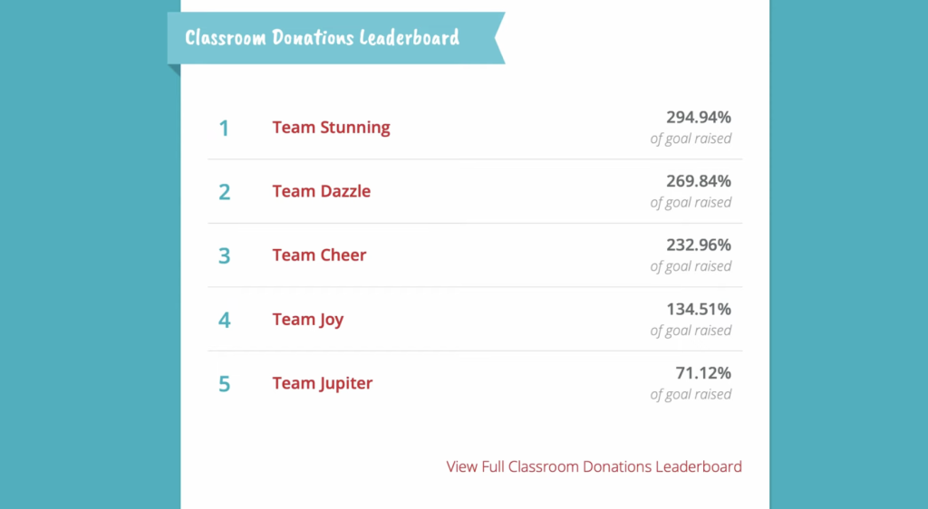 - Classroom Rivalries: A little competition between classrooms can ignite a fun, goal-driven environment. The Classroom Leaderboard on FundHub makes this easy to track in real-time!