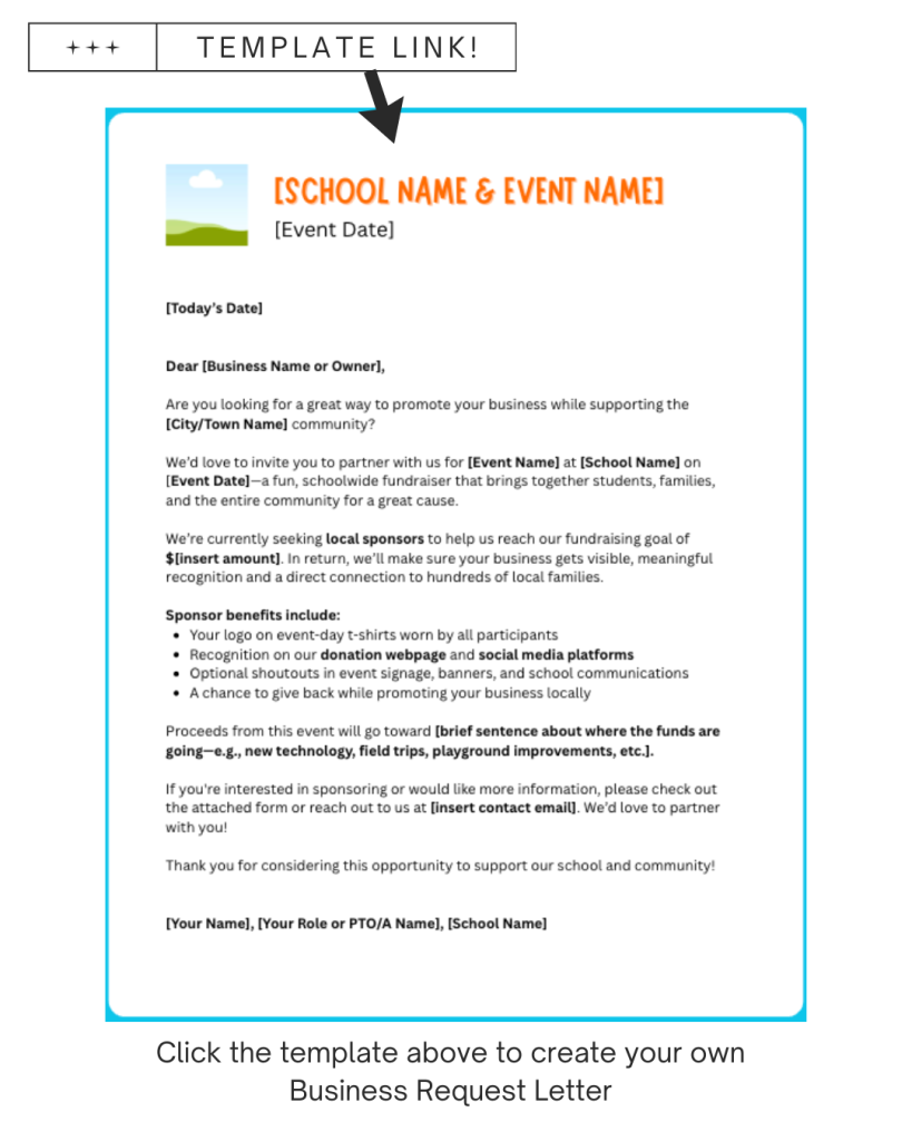 This editable Canva letter makes it easy to start the conversation with local businesses. Page 1 includes a few quick tips, and Page 2 is ready for you to customize with your school info.